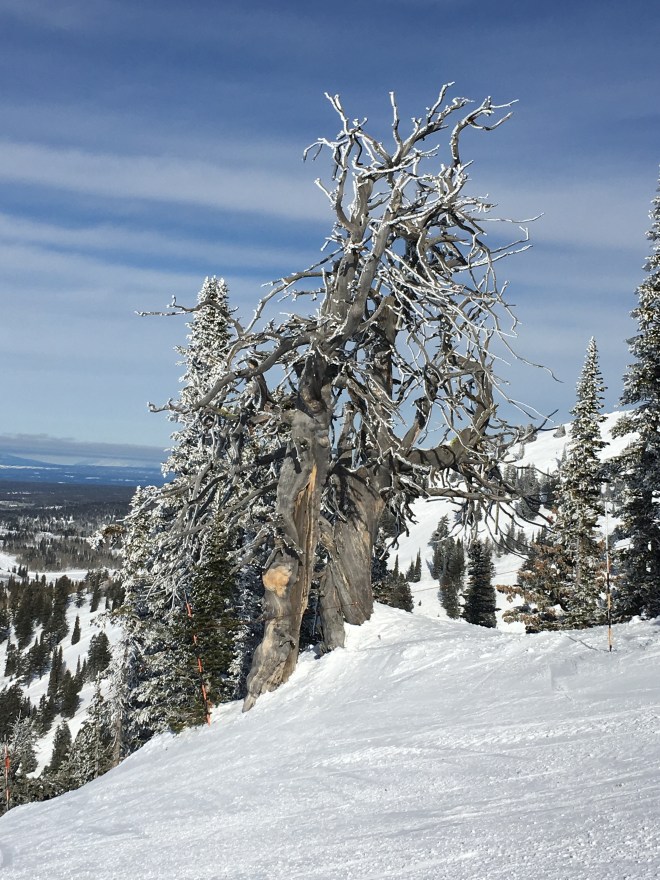 Almost a week has gone by, and in that time I’ve been to Big Sky and now am sitting in a fabulous AirBnB log house in the foothills of the Tetons outside of Driggs. I’m on the Idaho side—primarily because I have a good friend teaching at Grand Targhee and the rooms are significantly cheaper than the Jackson Hole side. There’s another storm coming through, so I haven’t decided whether I am staying put tomorrow or driving the 35 miles to Jackson Hole to ski.