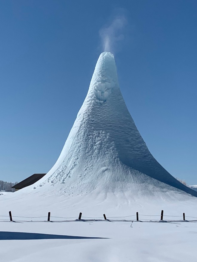 A treasure along the route was in Afton, Wy. There on the north end of town was an inverted snow cone! Or ice cone. I have googled the phenomenon, but cannot find anything on it. On the right side of the road, maybe a mile north of Afton is a cone of ice—I am deducing that it is formed from a thermal whose moisture and condensation had formed this cone, about 15 feet tall. It had steam rising from the top. It was the shape of a tall, skinny teepee with a hole at the top. I had never seen anything like it, and may never again! Except for maybe the Homestead Crater in Midway, Utah. Homestead Crater is a limestone dome that formed over a thermal spring which deposited minerals over thousands of years, creating a dome with a small hole at the top. It is an amazing place where a person can swim, soak or get certified in scuba diving!