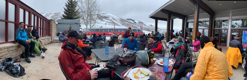To get to the Park City Mountain Village area there’s the Quicksilver Gondola to go over the separating ridge. At the top of the gondola, the extreme skiers were checking in to the Limelight peak, and the double black under the gondola. It looked icy. We all wondered about Ernest’s group that was skiing the extreme.