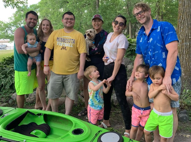 At the end of June I flew to Texas and drove back to Minnesota with Maiya and her three boys, all under 5 years old—a 1000 mile adventure. We celebrated Christmas in June at the lake, with my Zimmerman clan—Tom, Paige, Oliver, Maiya, Tony, Everett, Silas, Wesley, Lee, Kiba Dog, and me. It was special to have the lake home filled with family. Wessie called Ollie “MY baby.” So sweet.