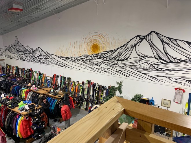 Finally on the way out of the Roaring Fork valley I stopped at the Ragged Mountain Sports store in Carbondale. The place was filled with skis, boots, jackets, pants and hiking and climbing gear. What I really liked was the wall mural—stylized mountains, in the vein of Alchemy of Ride (alchemyofride.org) so cool. I liked the vibe of this place and would definitely return if I were in the market for more gear…but I definitely am not looking for more.