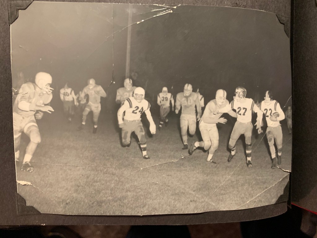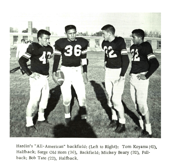 John was significantly younger than my dad at the time. He would have been in his 20s, my dad in his late 50s. But my brother Tom would have been John’s contemporary. I had three brothers, Tom/Tommy was the oldest. He was ten years my senior, and often played the role of mentor to me. Tommy was, as were all my brothers, an outstanding athlete. He placed at the Montana state wrestling championships, and was a running back on the Hardin Bulldogs football team. When Tommy played football, the backfield was dubbed “The All American Backfield”. We had Tommy, Japanese American, halfback; Sargie Old Horn, Crow Native, backfield; Mickey Beary, white, fullback; and Bobby Tate, African American, halfback. They were a powerful group to be reckoned with. At one point Tommy broke his wrist, but that didn’t stop him–with his cast on, he still played and carried the ball.