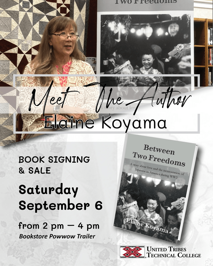 Anyone I know in Bismarck? I am going to be talking and signing my latest book, Between Two Freedoms on Saturday (tomorrow, September 6, 2025!) Join me from 2-4 pm at the United Tribes Technical College where the dedication of the Japanese Internment camp memorial at Ft. Lincoln–now the UTTC campus–is taking place. The dedication coincides with the PowWow celebration.