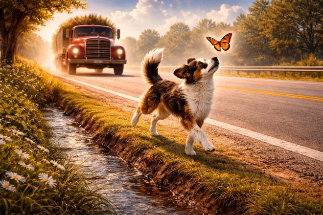 I called his name, he didn’t come back. We lived on Highway 47, the main road north out of town. A big truck came by and hit the dog. I stood on the cement, calling his name, but he was only a puppy, fascinated by butterflies. I was frozen, knowing I couldn’t run out to save the dog, knowing he was going to get hit, thinking how stupid following a butterfly was.